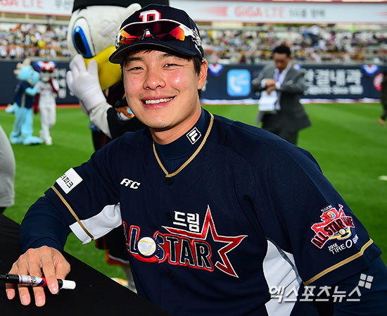 [엑스포츠뉴스=수원, 김한준 기자] 18일 오후 수원 kt위즈파크에서 열리는 '2015 KBO리그 올스타전' 드림 올스타와 나눔 올스타의 경기, 드림 올스타 민병헌이 포즈를 취하고 있다.