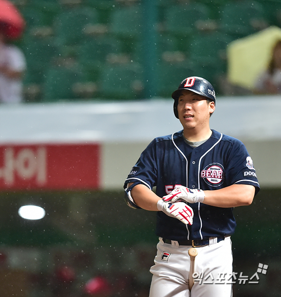9회초 2아웃 1, 2루 타석에 들어선 두산 김현수가 장갑을 고쳐 착용하고 있다.