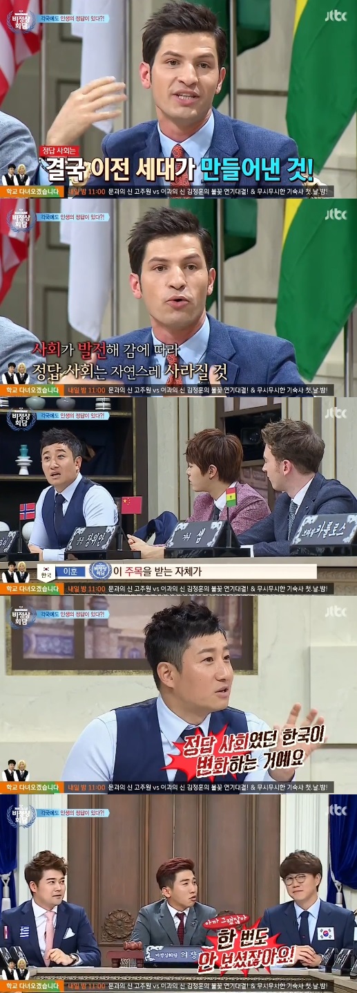 27일 방송된 종합편성채널 JTBC '비정상회담' 56회에서는 이훈이 게스트로 출연, 정답 사회에 대한 이야기를 나누었다.