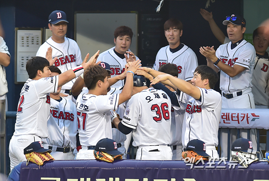 [엑스포츠뉴스=권혁재 기자] 2일 오후 서울 송파구 잠실야구장에서 열린 '2015 타이어뱅크 KBO리그' 삼성 라이온즈와 두산 베어스의 경기에서 삼성이 1-0으로 앞선 5회말 무사 1루 역전 투런포를 날린 두산 오재일이 동료들의 축하를 받고 있다.