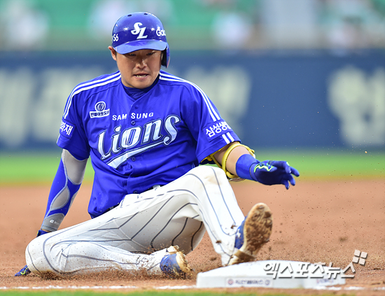 [엑스포츠뉴스=권혁재 기자] 2일 오후 서울 송파구 잠실야구장에서 열린 '2015 타이어뱅크 KBO리그' 삼성 라이온즈와 두산 베어스의 경기에서 삼성이 1-0으로 앞선 4회초 1아웃 우중간 안타를 날리 삼성 이지영이 3루까지 전력질주 슬라이딩 세이프 되고 있다.