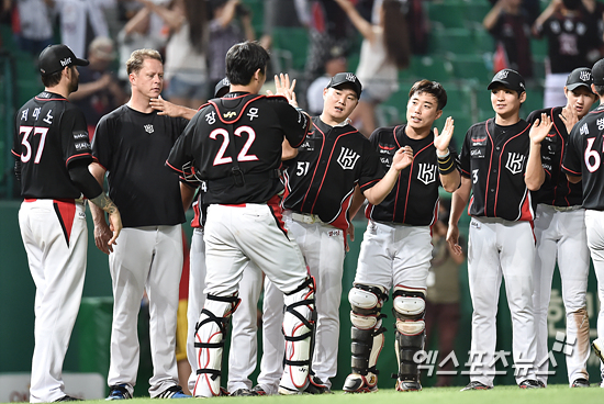 승리를 거둔 kt 선수들이 그라운드에서 하이파이브 하고 있다.