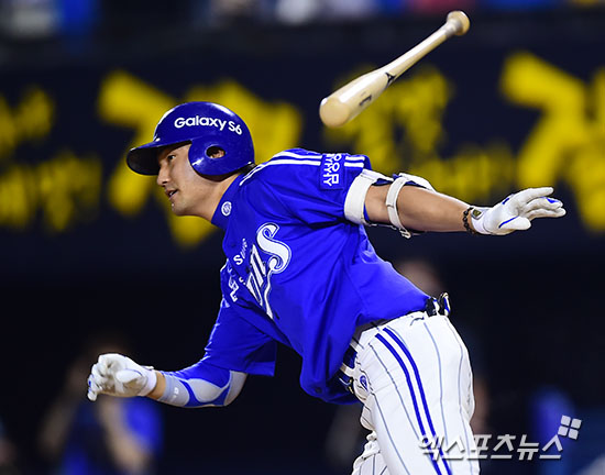 [엑스포츠뉴스=김한준 기자] 19일 오후 서울 송파구 잠실야구장에서 열린 '2015 타이어뱅크 KBO리그' 삼성 라이온즈와 두산 베어스의 경기, 7회초 1사 만루 삼성 김상수가 2타점 적시타를 날리고 있다.