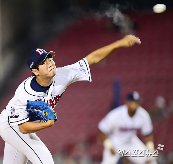 [엑스포츠뉴스=김한준 기자] 19일 오후 서울 송파구 잠실야구장에서 열린 '2015 타이어뱅크 KBO리그' 삼성 라이온즈와 두산 베어스의 경기, 7회초 1사 1,2루 두산 함덕주가 공을 힘차게 던지고 있다.