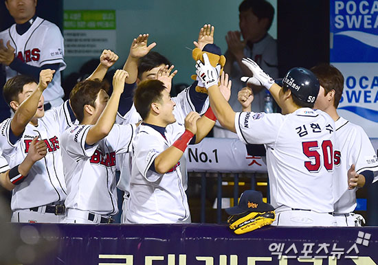 [엑스포츠뉴스=김한준 기자] 26일 오후 서울 송파구 잠실야구장에서 열린 '2015 타이어뱅크 KBO리그' 롯데 자이언츠와 두산 베어스의 경기, 4회말 1사 2,3루 두산 김현수가 역전 스리런 홈런을 날린 후 더그아웃에서 하이파이브를 하고 있다.