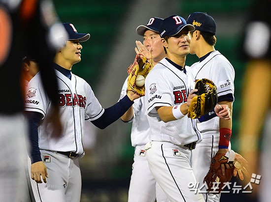 이날 경기에서 승리한 두산 선수들이 하이파이브를 하고 있다.