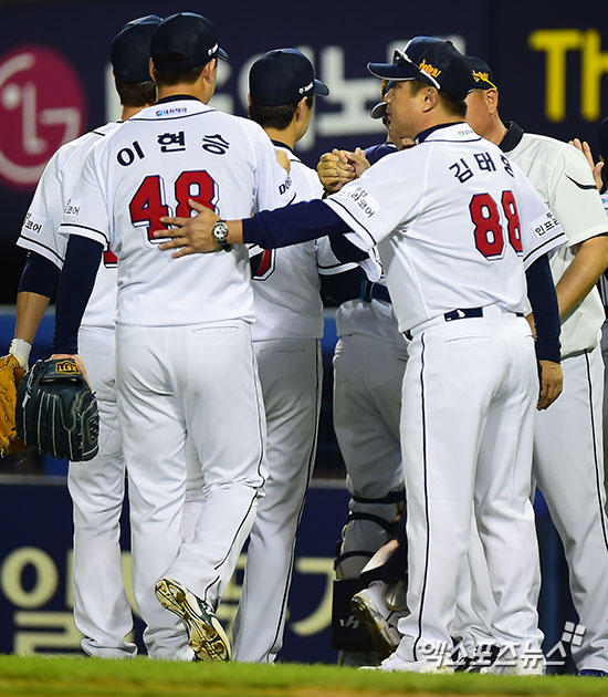 이날 경기에서 승리한 두산 김태형 감독이 이현승과 하이파이브를 하고 있다.
