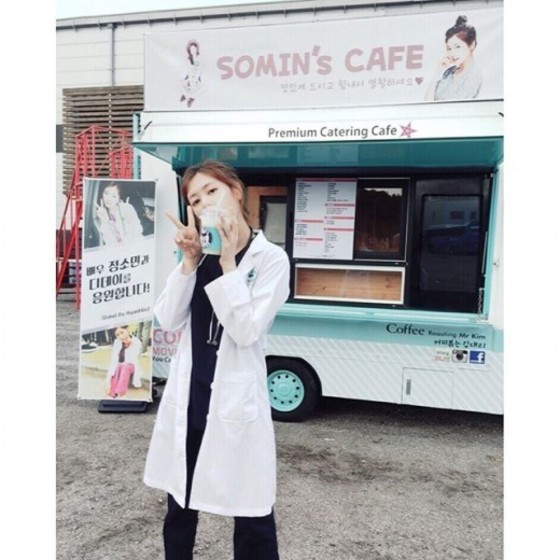 사진 속 정소민은 JTBC 새 드라마 '디데이' 촬영 중 팬들이 준비한 커피차 앞에 서 애교 있는 포즈를 취했다.