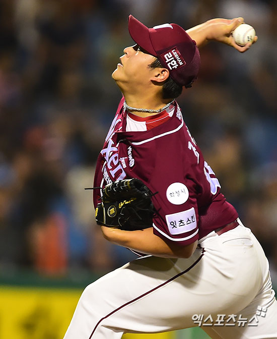 [엑스포츠뉴스=대전, 김한준 기자] 4일 오후 대전광역시 중구 한화생명 이글스파크에서 열린 '2015 타이어뱅크 KBO리그' 넥센 히어로즈와 한화 이글스의 경기, 9회말 넥센 조상우가 공을 힘차게 던지고 있다.