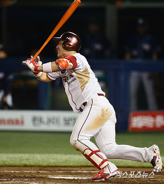 [엑스포츠뉴스=김한준 기자] 9일 오후 서울 목동야구장에서 열린 '2015 타이어뱅크 KBO리그' 두산 베어스와 넥센 히어로즈와의 경기, 4회말 2사 1,3루 넥센 박동원이 1타점 적시타를 날리고 있다.
