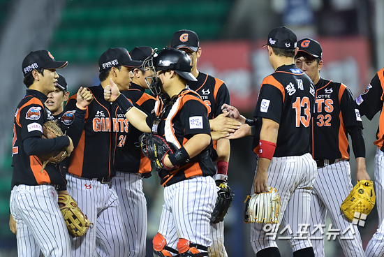 승리를 거둔 롯데 선수들이 마운드에 모여 하이파이브 하고 있다.