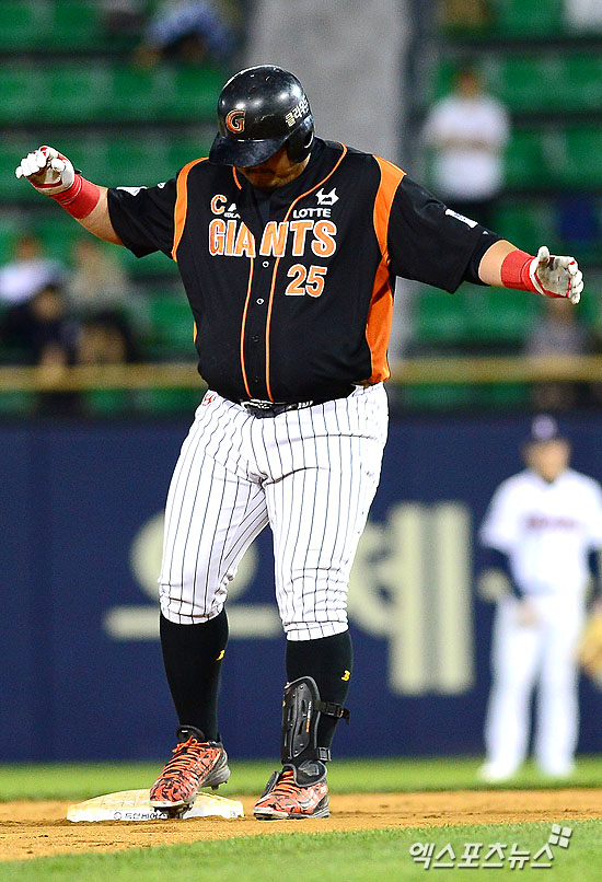 [엑스포츠뉴스=권태완 기자] 16일 오후 서울시 송파구 잠실야구장에서 열린 '2015 타이어뱅크 KBO리그' 롯데 자이언츠와 두산 베어스의 경기에 7:7 동점 롯데공격 12회초 무사 롯데 최준석이 2루타를 치고 기뻐하고 있다.