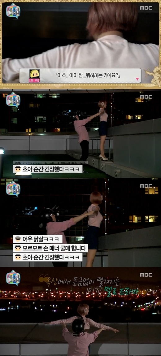 이날 초아는 모르모트PD를 옥상으로 데려갔다. 모르모트PD는 초아의 뒤에서 양팔을 잡았고, "타이타닉 영화 못 보셨냐"라며 영화 '타이타닉' 명장면을 패러디했다.