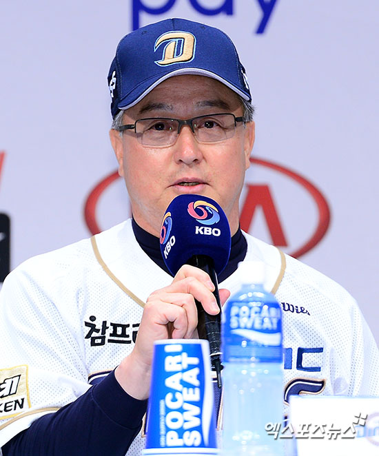 [엑스포츠뉴스=창원, 김한준 기자] 17일 오후 경남 창원 마산종합운동장 올림픽기념공연장에서 열린 '2015 타이어뱅크 KBO리그 포스트시즌' 플레이오프 미디어데이에 참석한 NC 김경문 감독이 1차전 선발투수를 예고하고 있다.