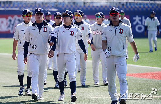 [엑스포츠뉴스=창원, 김한준 기자] 18일 오후 경남 창원 마산종합운동장에서 열린 '2015 타이어뱅크 KBO리그 포스트시즌' 두산 베어스와 NC 다이노스의 플레이오프 1차전 경기, 두산 선수들이 타격훈련을 위해 더그아웃으로 향하고 있다.