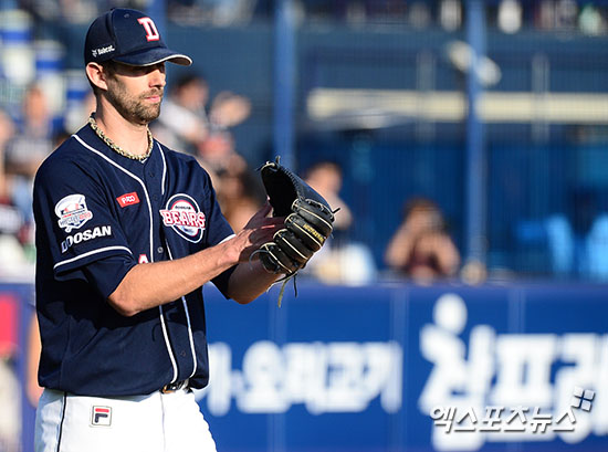 [엑스포츠뉴스=창원, 김한준 기자] 18일 오후 경남 창원 마산야구장에서 열린 '2015 타이어뱅크 KBO리그 포스트시즌' 두산 베어스와 NC 다이노스의 플레이오프 1차전 경기, 6회말 수비를 마친 두산 선발투수 니퍼트가 박수를 치며 야수들을 기다리고 있다.