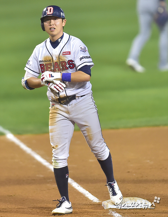 [엑스포츠뉴스=잠실, 박진태 기자] 두산 베어스 정수빈이 플레이오프 최다 3루타 기록을 경신했다.