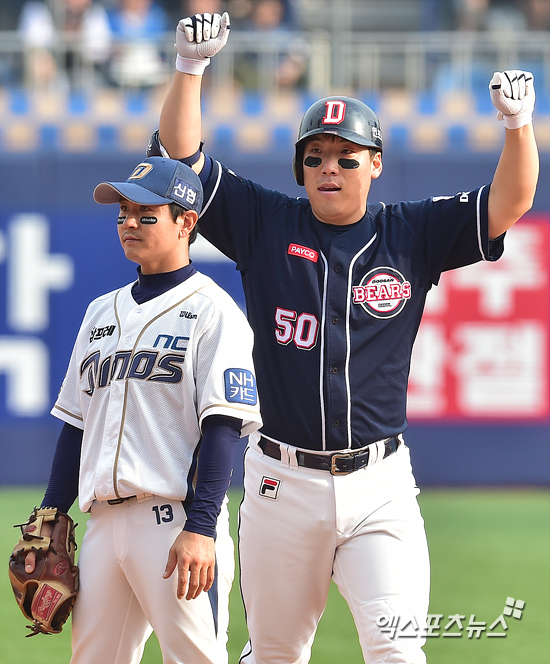 [엑스포츠뉴스=창원, 권혁재 기자] 24일 오후 경남 창원 마산야구장에서 열린 '2015 타이어뱅크 KBO리그 포스트시즌' 두산 베어스와 NC 다이노스의 플레이오프 5차전 경기, 2-2 동점인 5회초 무사 만루 2타점 역전 적시 2루타를 친 두산 김현수가 환호하고 있다.
