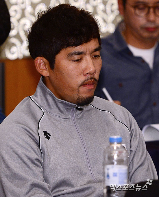 [엑스포츠뉴스=김한준 기자] 26일 오후 서울 독산동 노보텔앰배서더 독산에서 열린 '2015 WBSC 프리미어12 대표팀 소집 및 기자회견'에 참석한 한화 이용규가 대회 운영 전반에 대한 설명을 듣고 있다.