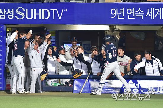 [엑스포츠뉴스=대구, 권혁재 기자] 26일 오후 대구광역시 대구시민야구장에서 열린 '2015 타이어뱅크 KBO리그' 두산 베어스와 삼성 라이온즈의 한국시리즈 1차전 경기, 1회초 1아웃 두산 허경민이 선제 솔로포를 치고 들어와 동료들과 하이파이브 하고 있다.