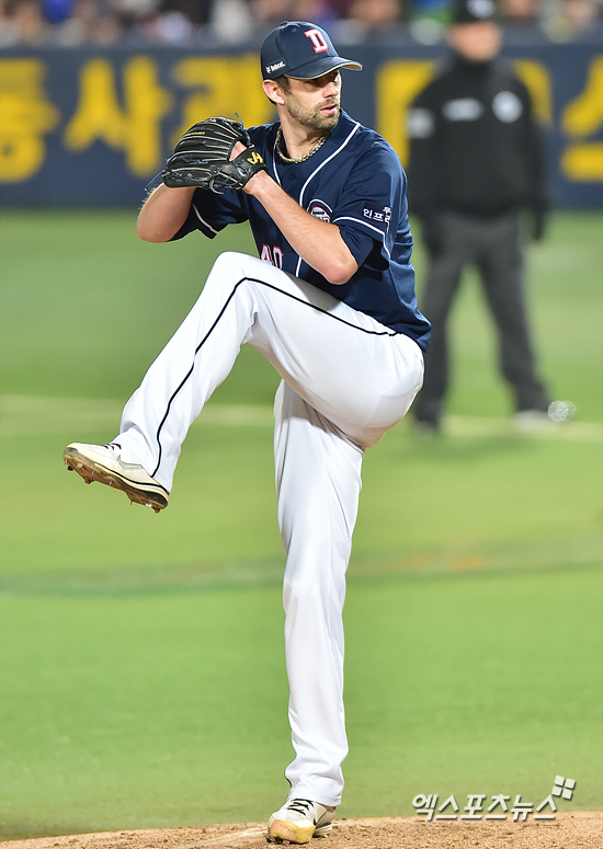 [엑스포츠뉴스=대구, 권혁재 기자] 27일 오후 대구광역시 대구시민야구장에서 열린 '2015 타이어뱅크 KBO리그' 두산 베어스와 삼성 라이온즈의 한국시리즈 2차전 경기, 두산 선발투수 니퍼트가 힘차게 공으르 던지고 있다.