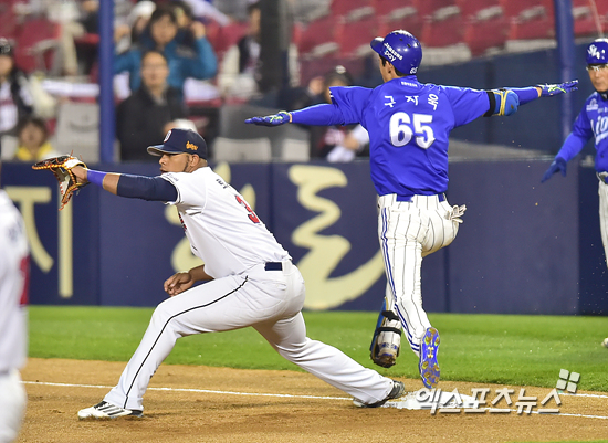 [엑스포츠뉴스=권혁재 기자] 29일 오후 서울 송파구 잠실야구장에서 열린 '2015 타어이뱅크 KBO리그' 삼성 라이온즈와 두산 베어스의 한국시리즈 3차전 경기, 1회초 선두타자 삼성의 구자욱이 내야안타를 치고 세이프 되고 있다.