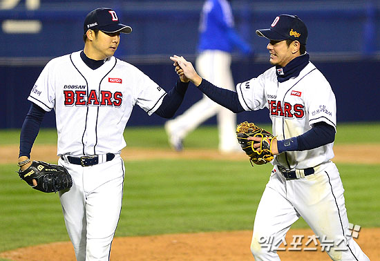 [엑스포츠뉴스=권태완 기자] 29일 오후 서울 송파구 잠실야구장에서 열린 '2015 타이어뱅크 KBO리그 한국시리즈 3차전' 삼성 라이온즈와 두산 베어스의 경기에 3:1로 앞선 두산수비 6회초 2사 주자 1-3루에서 삼성 박석민의 내야땅볼을 두산 김재호가 잡아 1루 아웃시키자 장원준이 고마움의 표시를 하고 있다.