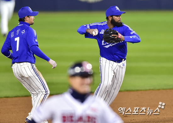 [엑스포츠뉴스=권혁재 기자] 29일 오후 서울 송파구 잠실야구장에서 열린 '2015 타어이뱅크 KBO리그' 삼성 라이온즈와 두산 베어스의 한국시리즈 3차전 경기, 두산이 3-1로 앞선 6회말 1아웃 만루 삼성 2루수 나바로가 두산 허경민의 타구를 잡아 1루 주자를 2루 포스아웃 시킨 후 1루 송구를 하고 있다.