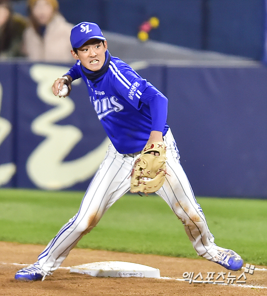 [엑스포츠뉴스=권혁재 기자] 30일 오후 서울 송파구 잠실야구장에서 열린 '2015 타어이뱅크 KBO리그' 삼성 라이온즈와 두산 베어스의 한국시리즈 4차전 경기, 1회말 1아웃 2, 3루 삼성 1루수 구자욱이 두산 김현수의 강한 땅볼 타구를 잡아 포스아웃 시킨 후 홈에 송구하고 있다.