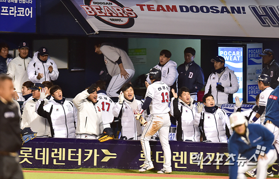 [엑스포츠뉴스=권혁재 기자] 30일 오후 서울 송파구 잠실야구장에서 열린 '2015 타어이뱅크 KBO리그' 삼성 라이온즈와 두산 베어스의 한국시리즈 4차전 경기, 1회말 1아웃 2, 3루 두산 김현수의 1루 땅볼을 잡은 삼성 1루수 구자욱의 홈 송구 에러로 인해 3루주자 정수빈에 이어 홈을 밟은 허경민이 동료들과 하이파이브 하고 있다.