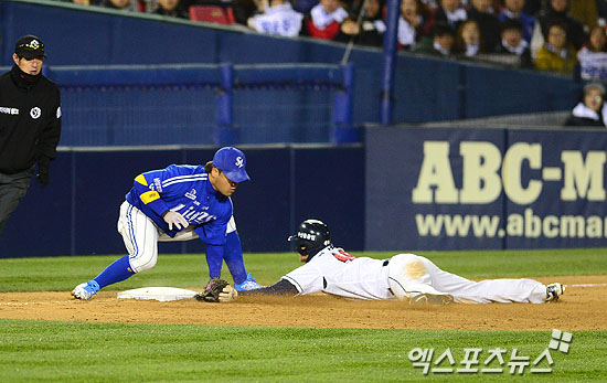 [엑스포츠뉴스=권태완 기자] 30일 오후 서울 송파구 잠실야구장에서 열린 '2015 타이어뱅크 KBO리그 한국시리즈 4차전' 삼성 라이온즈와 두산 베어스의 경기에 4:3으로 앞선 두산공격 8회말 1사 주자 2루에서 차우찬의 투구가 원바운드로 들어가 2루주자 민병헌이 3루도루를 시도했지만 박석민에게 태그아웃되고 있다.