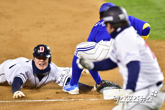 [엑스포츠뉴스=권혁재 기자] 30일 오후 서울 송파구 잠실야구장에서 열린 '2015 타어이뱅크 KBO리그' 삼성 라이온즈와 두산 베어스의 한국시리즈 4차전 경기, 두산이 4-3으로 앞선 9회말 1아웃 2루 삼성 투수 차우찬의 폭투에 3루 도루를 시도하던 두산 민병헌이 태그아웃 당하고 있다.
