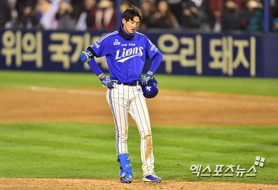 9회초 2아웃 만루 찬스를 살리지 못한 삼성 구자욱이 한동안 그라운드에서 발걸음을 옮기지 못하고 있다.