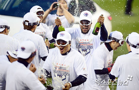 [엑스포츠뉴스=김한준 기자] 31일 오후 서울 송파구 잠실야구장에서 열린 '2015 타어이뱅크 KBO리그' 삼성 라이온즈와 두산 베어스의 한국시리즈 5차전 경기, 17안타에 13득점을 뽑아내는 공격력을 선보인 두산이 삼성에 13-2로 승리하며 14년만에 한국시리즈 우승을 차지했다.