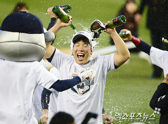 한국시리즈 우승을 차지한 두산 김현수가 샴페인을 뿌리며 기뻐하고 있다.