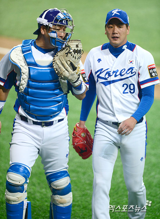 [엑스포츠뉴스=김한준 기자] 4일 오후 서울 고척스카이돔에서 열린 '2015 서울 슈퍼시리즈' 대한민국 대표팀과 쿠바 대표팀의 경기, 1회초 수비를 마친 대한민국 강민호와 김광현이 대화를 나누며 더그아웃으로 향하고 있다.