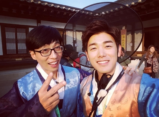 사진은 '무한도전' 촬영장에서 찍은 것으로, 에릭남은 방송인 유재석과 함께 밝은 미소를 지으며 카메라를 응시하고 있다. 한복을 입은 두 사람의 모습이 이색적이다.