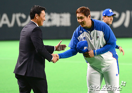 [엑스포츠뉴스=삿포로(일본) 권태완 기자] 8일 오후 일본 훗쿠오카 삿포로 돔구장에서 열린 '프리미어12' 개막전 대한민국과 일본 경기전 훈련에 이대호가 해설위원으로 경기장을 찾은 이승엽과 인사를 하고 있다.