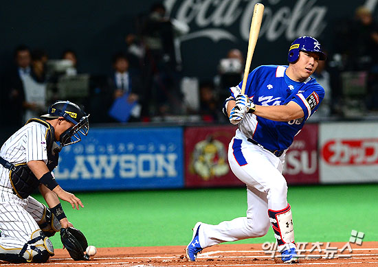 [엑스포츠뉴스=삿포로(일본) 권태완 기자] 8일 오후 일본 훗쿠오카 삿포로 돔구장에서 열린 '프리미어12' 개막전 대한민국과 일본 경기에 1회초 2사 김현수가 삼진을 알하고 있다.