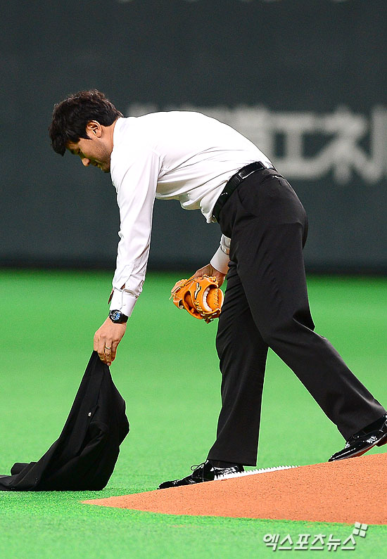 [엑스포츠뉴스=삿포로(일본) 권태완 기자] 8일 오후 일본 훗쿠오카 삿포로 돔구장에서 열린 '프리미어12' 개막전 대한민국과 일본 경기에 박찬호가 시구를 위해 자켓을 벗고 있다.