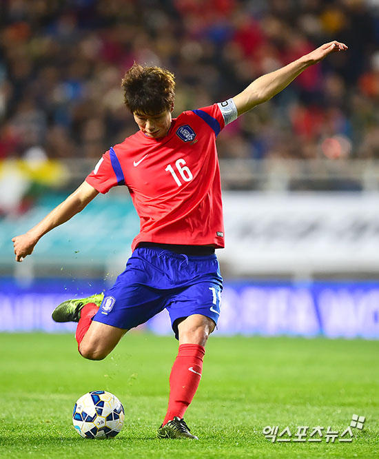 [엑스포츠뉴스=수원, 김한준 기자] 12일 오후 경기도 수원월드컵경기장에서 열린 '2018 러시아 월드컵 아시아지역 2차 예선' 대한민국과 미얀마의 경기, 대한민국 기성용이 중거리슛을 시도하고 있다.
