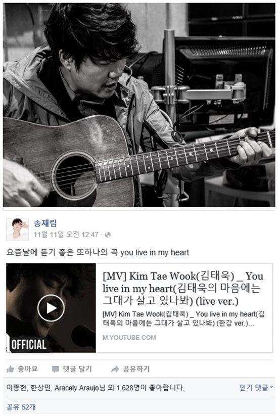 송재림은 지난 11일 자신의 페이스북을 통해 "요즘 날에 듣기 좋은 또 하나의 곡 you live in my heart" 라는 글과 함께 김태욱의 신곡 '김태욱의 마음에는 그대가 살고 있나봐' 의 뮤직비디오를 링크로 선보였다.