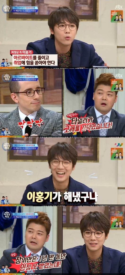이에 MC들은 "타일러를 설득해보겠다. 논리적인 이홍기 씨"라며 이홍기에 발언권을 넘겼다. 이홍기는 "하루에 아르바이트를 세 개나 하면서 취업에 대한 생각한다는 건 '생각만' 하는 것 같다"고 말문을 열었다.