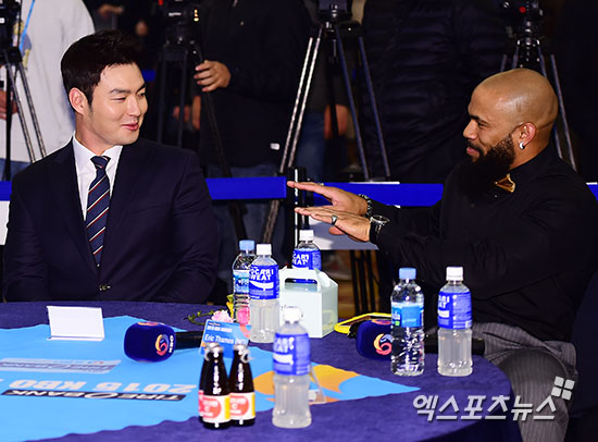 [엑스포츠뉴스=김한준 기자] 24일 오후 서울 양재동 The-K 호텔 컨벤션센터에서 열린 '2015 타이어뱅크 KBO 시상식’에서 박병호와 테임즈가 대화를 나누고 있다.