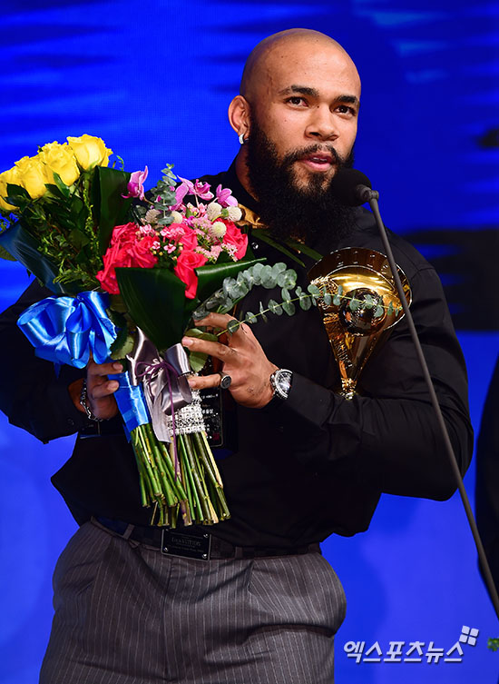 [엑스포츠뉴스=김한준 기자] 24일 오후 서울 양재동 The-K 호텔 컨벤션센터에서 열린 '2015 타이어뱅크 KBO 시상식’에서 타율상, 득점상, 장타율상, 출루율상을 수상한 NC 테임즈가 소감을 말하고 있다.
