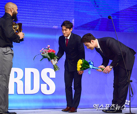 [엑스포츠뉴스=김한준 기자] 24일 오후 서울 양재동 The-K 호텔 컨벤션센터에서 열린 '2015 타이어뱅크 KBO 시상식’에서 넥센 박병호가 타율상, 득점상, 장타율상, 출루율상을 수상한 NC 테임즈를 축하하고 있다.