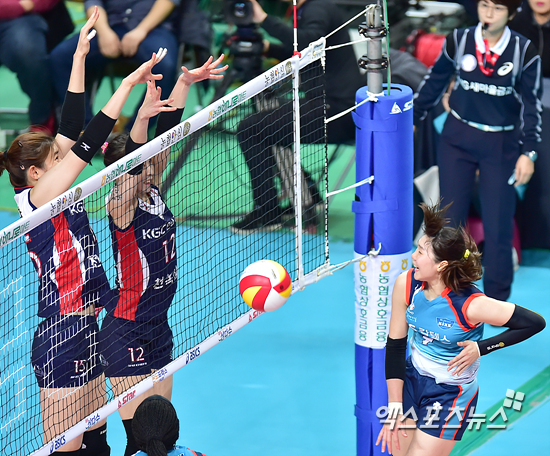 [엑스포츠뉴스=권혁재 기자] 3일 오후 서울 중구 장충체육관에서 열린 'NH농협 2015-2016 프로배구' 여자부 서울 GS칼텍스 KIXX와 대전 KGC인삼공사의 경기, GS 이소영의 강스파이크 공격이 상대 블로킹에 막히고 있다.
