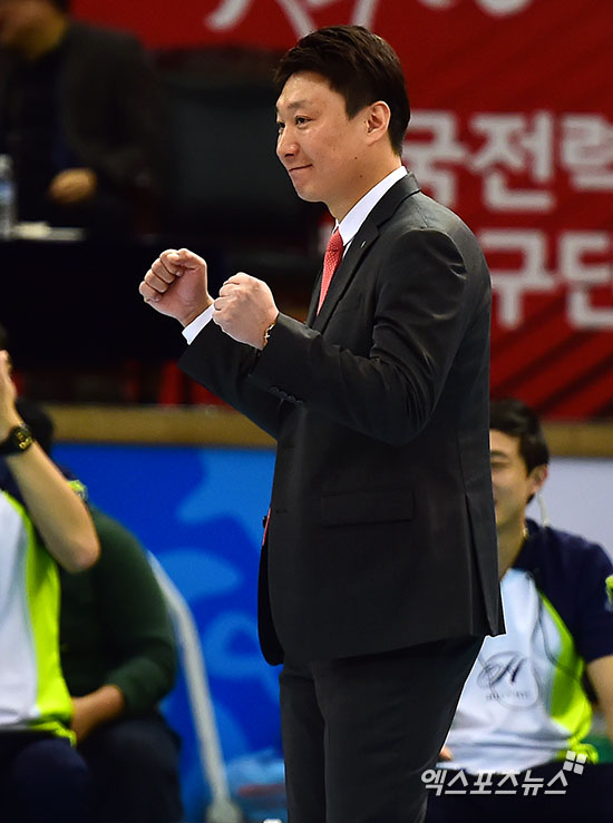 [엑스포츠뉴스=수원, 김한준 기자] 5일 오후 경기도 수원시 장안구 수원실내체육관에서 열린 'NH농협 2015-2016 V-리그' 현대건설 힐스테이트와  IBK기업은행 알토스의 여자부 경기, 현대건설 양철호 감독이 주먹을 불끈 쥐며 기뻐하고 있다.