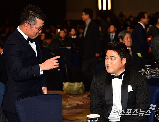 [엑스포츠뉴스=김한준 기자] 8일 오후 서울 양재동 The-K 호텔 컨벤션센터에서 열린 '2015 타이어뱅크 KBO 골든글러브 시상식'에 참석한 정근우와 박석민이 대화를 나누고 있다.