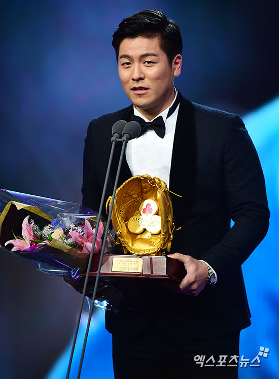 [엑스포츠뉴스=김한준 기자] 8일 오후 서울 양재동 The-K 호텔 컨벤션센터에서 열린 '2015 타이어뱅크 KBO 골든글러브 시상식'에서 사랑의 골든글러브를 수상한 롯데 강민호가 수상소감을 말하고 있다.